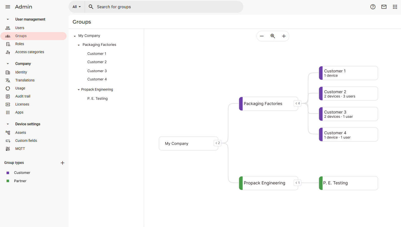 Required moduleTo visualize the Hierarchical user groups in your company, you will need the Subgroups module. Check your modules at Admin > Licenses. To obtain this module, contact your IXON account manager or IXON distributor.