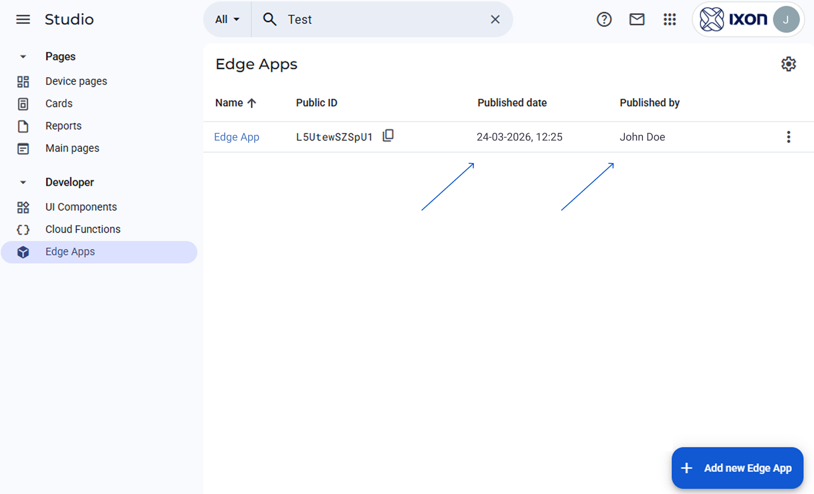 Your Edge App should be now visible in the Studio. This is confirmed if the Published date and Published by columns are populated.